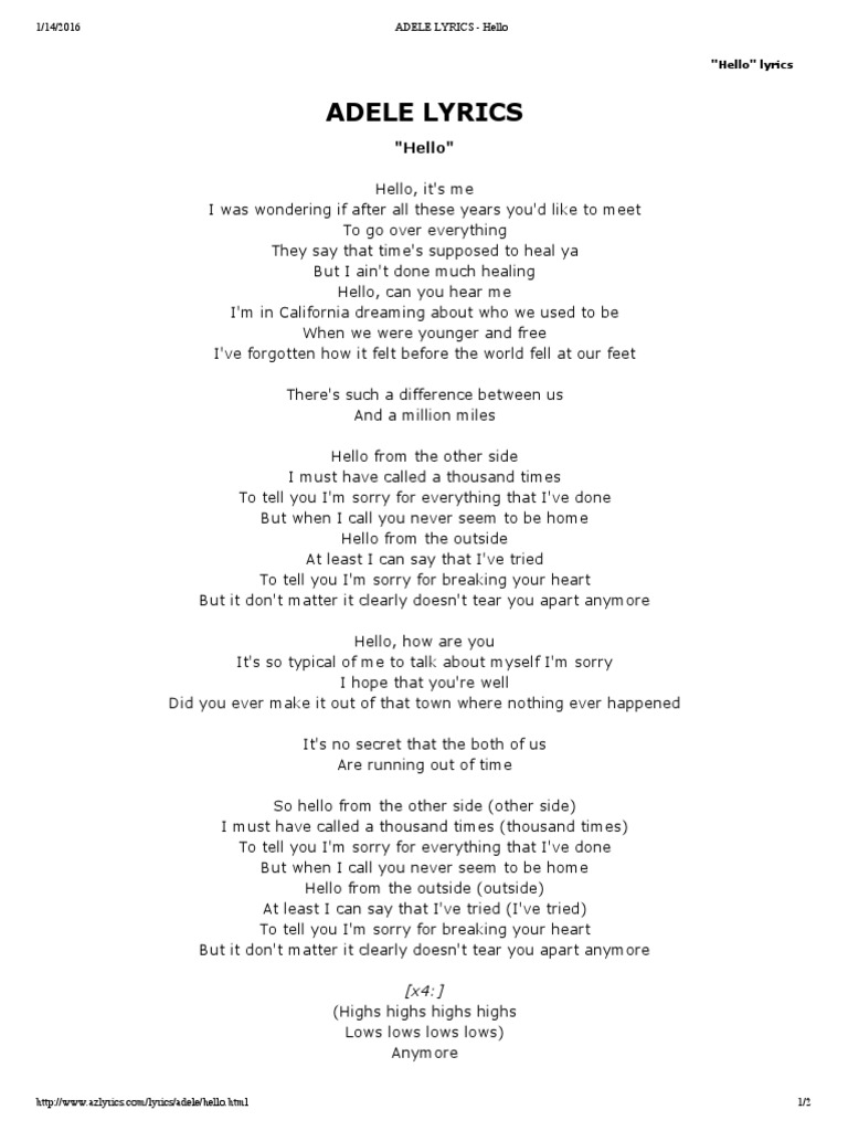 Adele Lyrics Hello - Skachat minus pesni «hello» 320kbps. Adele Lyrics Hello : I'm in california dreaming about who we used to be when we were younger.