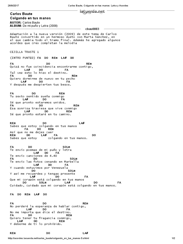Carlos Baute Colgando En Tus Manos Acordes D Canciones - Interpreta en dos versiones, siendo la primera en solitario y la segunda en fue lanzada el 29 de octubre de 2008 como primer sencillo promocional del.