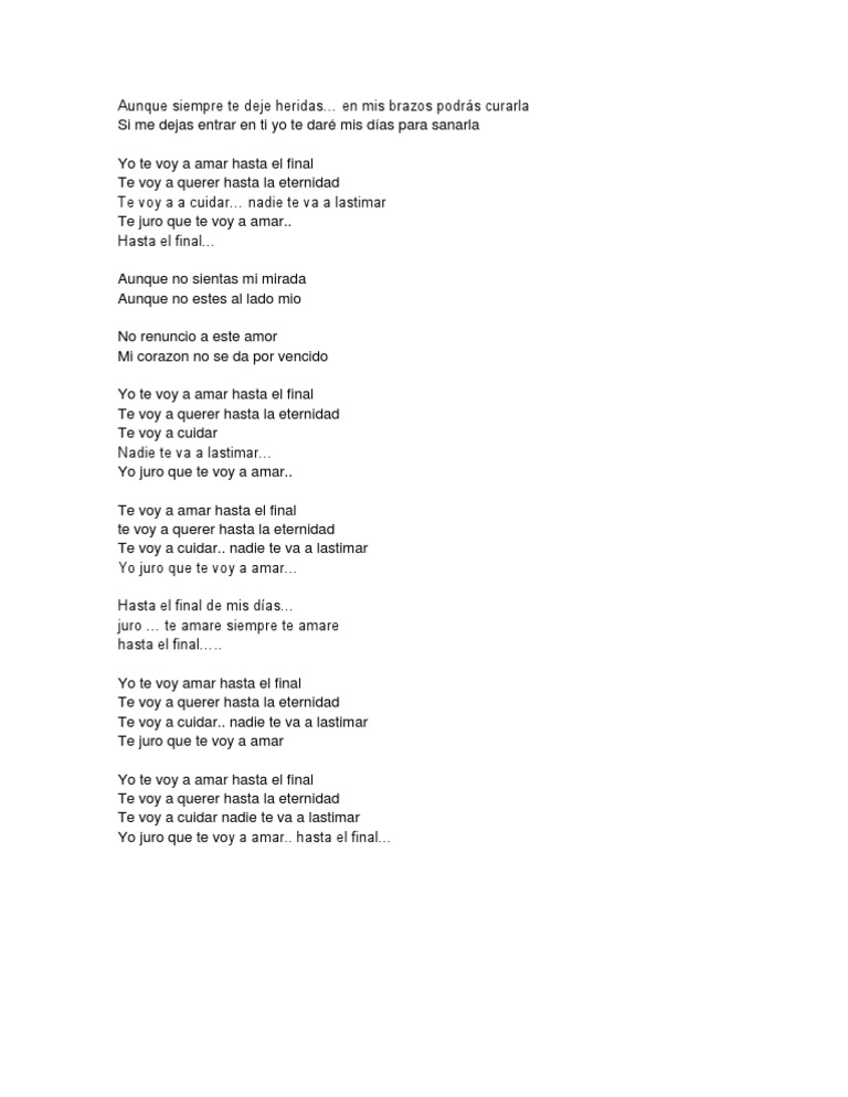Hasta El Final Letra - Que no puedas calmar cuando haya un vacio que no puedas llenar te abrazare, te hare olvidar, lo que te hizo sufrir no vas a caer, mientras que estes junto a mi si siente un frio tu corazon, sere tu abrigo, tu ilusion hasta ya no respirar, yo te voy amar.